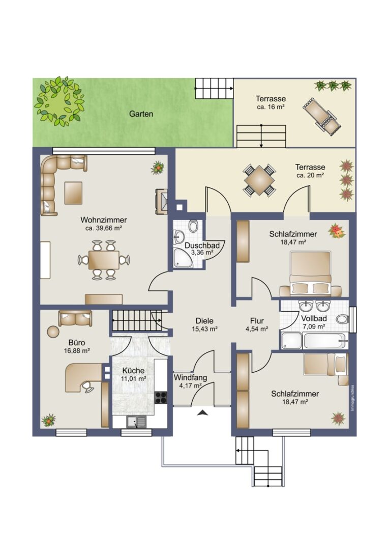 Rechterhand befindet sich ein großzügiges Vollbad, welches modern gestaltet ist, sowie zwei Schlafzimmer. Ein Schlafzimmer punktet mit einem direkten Zugang zur überdachten Terrasse, die eine harmonische Verbindung zum Außenbereich schafft und gleichzeitig Zugang zu einer weiteren südöstlich ausgerichteten Terrasse bietet. Hier können Sie die Sonne genießen und gesellige Momente im Freien verbringen. Von der Terrasse gelangen Sie über eine Treppe direkt in den Garten, in dem Sie Ihre Ideen freien Lauf lassen können und Ihre persönliche Wohlfühloase gestalten können.