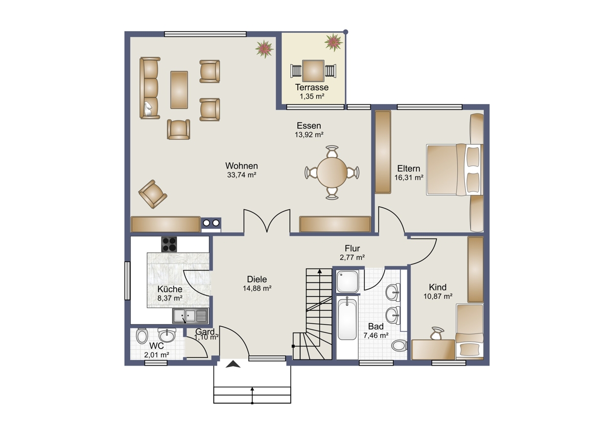 Beim Betreten des Hauses werden Sie von einer einladenden Diele begrüßt, die den perfekten Empfang für Ihre Gäste bietet. Gleich zu Beginn steht Ihnen ein praktisches Gäste-WC zur Verfügung. Der stilvolle Flur führt Sie weiter in die Küche. Hier ist nicht nur Platz für einen kleinen Essbereich, hier können Sie gemeinsame Mahlzeiten mit Ihrer Familie und Ihren Freunden genießen.
