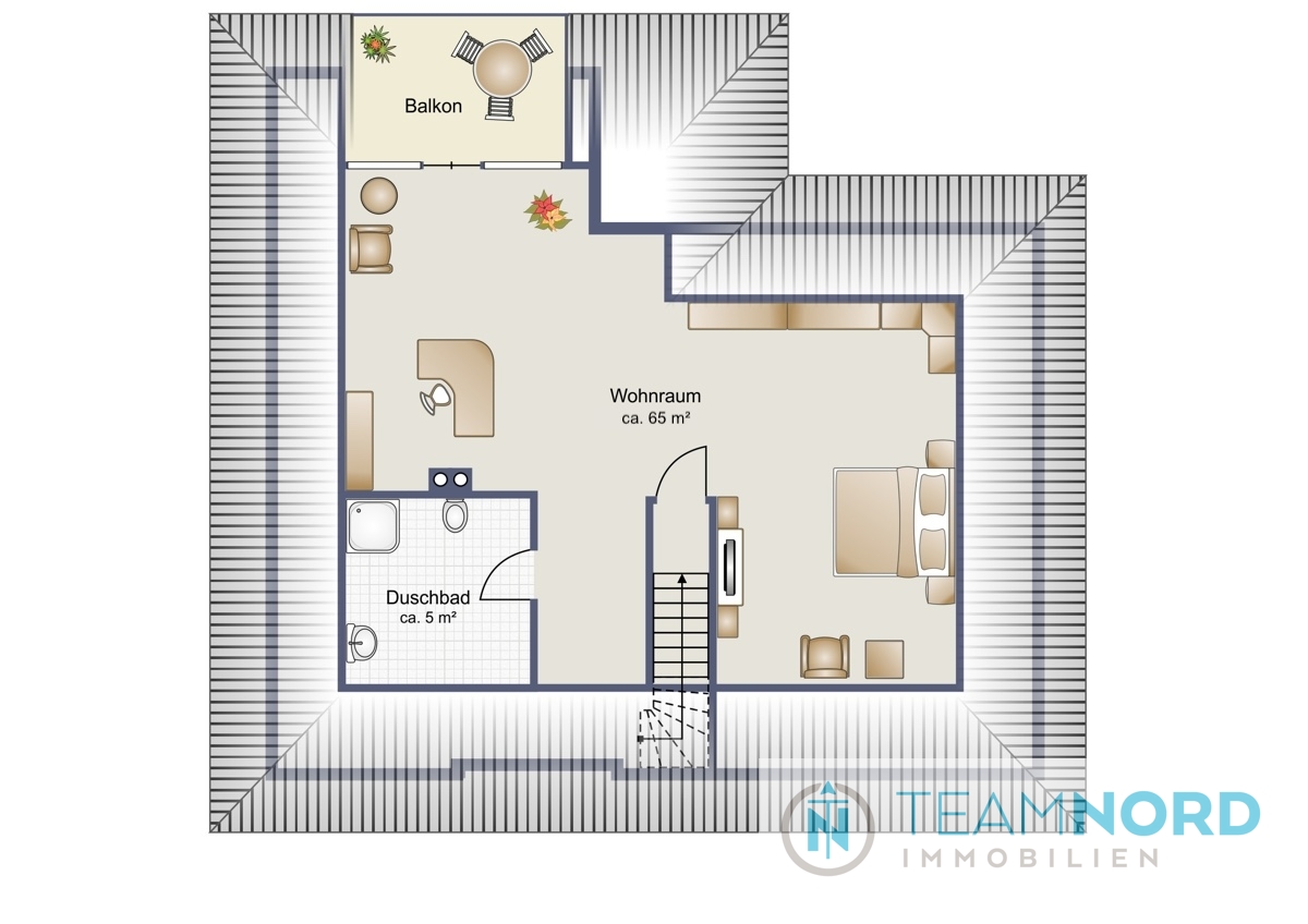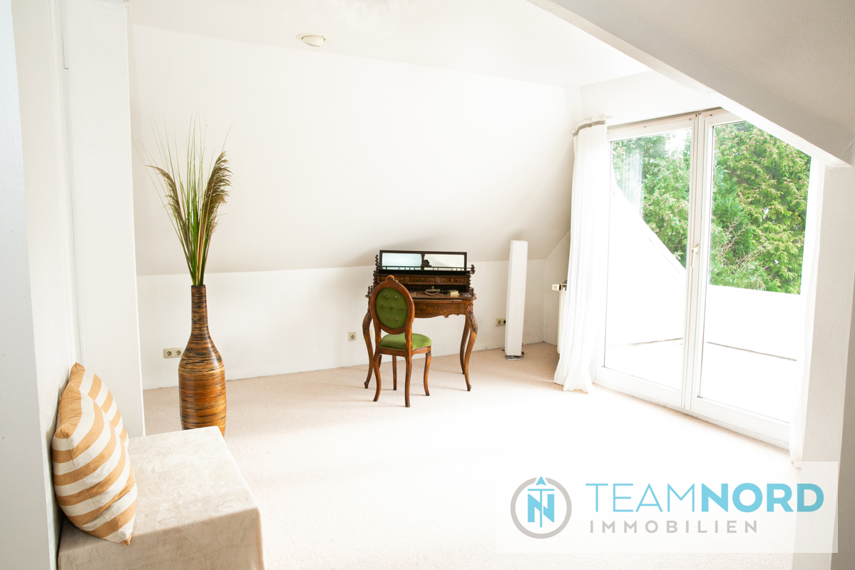Eine elegante Treppe führt Sie von der Diele in das ausgebaute Dachgeschoss. Hier stehen Ihnen ca. 65 m² zur Verfügung, welche vielfältig nutzbar sind. Ein praktisches Duschbad sowie die Option, eine Küchennische einzubauen und das Dachgeschoss in zwei Zimmer zu unterteilen, machen diesen Raum zu einem vielseitigen Bereich, der sich Ihren individuellen Bedürfnissen anpassen lässt. Außerdem steht Ihnen hier ein nach Süden ausgerichteter Balkon zur Verfügung, welcher Ihnen einen atemberaubenden Ausblick auf die Umgebung bietet.