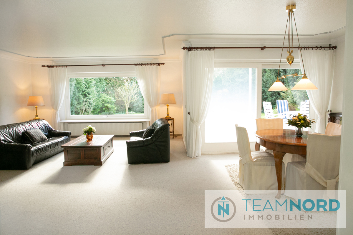 Angrenzend an die Küche befindet sich das Highlight des Erdgeschosses, das ca. 33 m² große Wohnzimmer, welches ebenfalls Platz für einen Essbereich bietet. Die großzügigen Fensterfronten lassen viel Tageslicht herein und bieten einen malerischen Blick auf die südlich ausgerichtete Terrasse und den weitläufigen Garten. Hier können Sie entspannte Stunden im Freien verbringen, die Natur genießen und gemütliche Grillabende mit Ihren Liebsten veranstalten.