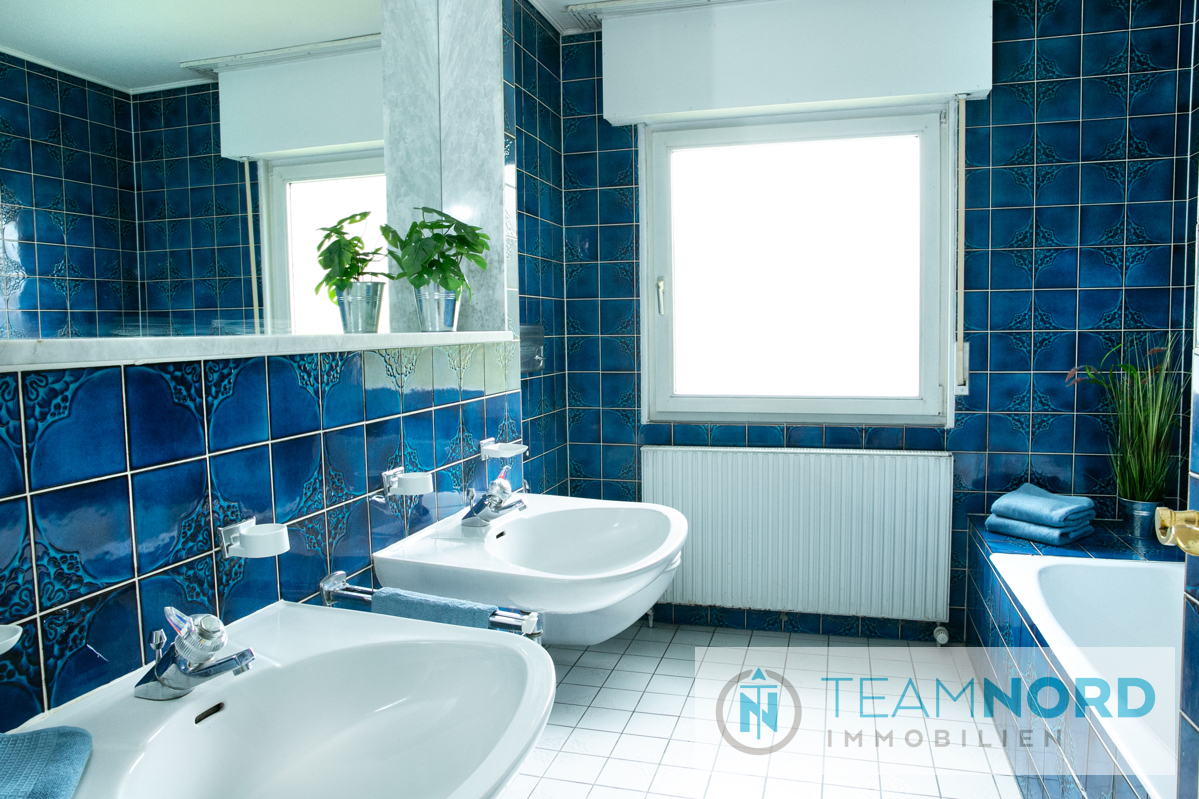 Ebenfalls im Erdgeschoss befindet sich ein voll ausgestattetes Badezimmer mit zwei Waschbecken, welches Komfort und Funktionalität bietet.