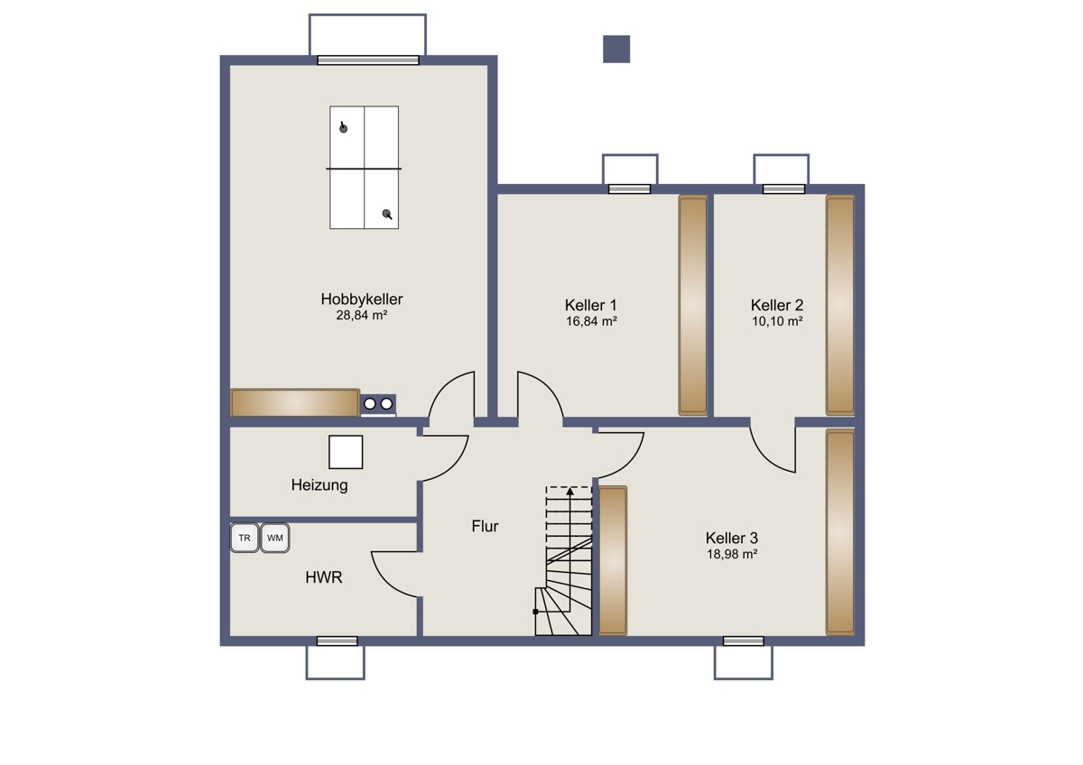 Weiteren Platz finden Sie im Untergeschoss des Hauses. Hier befinden sich vier großzügige Kellerräume, die Ihnen zusätzlichen Stauraum bieten. Platz für einen Bürobereich, einen Hobbyraum, einen Fitnessraum, oder einfach alles, Sie entscheiden. Auch ein HWR ist im Keller gegeben und ist so gestaltet, dass Sie ausreichend Platz für Ihre Utensilien haben. Ein separater Heizungsraum komplettiert das Untergeschoss und sorgt für wohlige Wärme in Ihrem Zuhause.