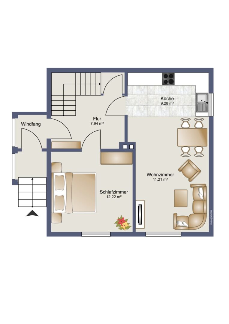 Von einem Windfang gelangen Sie in einen gemütlichen Flur, von dem Sie die ersten Räume betreten. Gleich vorne erwartet Sie das großzügige Schlafzimmer, in dem nicht nur ein Bett, sondern auch ein großer Kleiderschrank Platz findet. Die Außenrollläden sorgen hier für einen erholsamen Schlaf und finden sich auch im Wohn-, Küchen- und Essbereich wieder. Dieser Bereich, direkt neben dem Schlafzimmer, bietet mit seinen ca. 20 m² die perfekte Größe, um Esszimmer und Wohnzimmer zu vereinen und schafft eine einladende und gemütliche Atmosphäre.