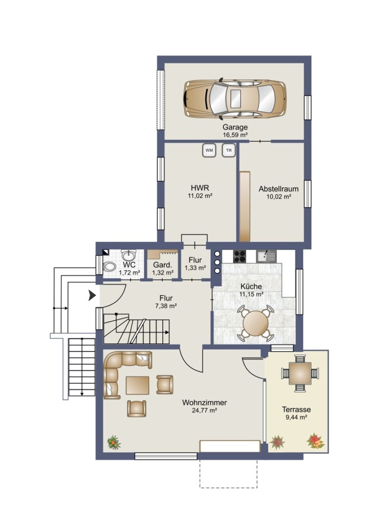 Nur wenige Stufen führen hinunter in den Hauswirtschaftsraum mit zusätzlicher Dusche – praktisch im Alltag und vielseitig nutzbar. Direkt angrenzend: ein wohnlich gestalteter Zusatzraum mit Zugang zur angrenzenden Garage – ideal als Hobbybereich, Arbeitszimmer oder Rückzugsort.