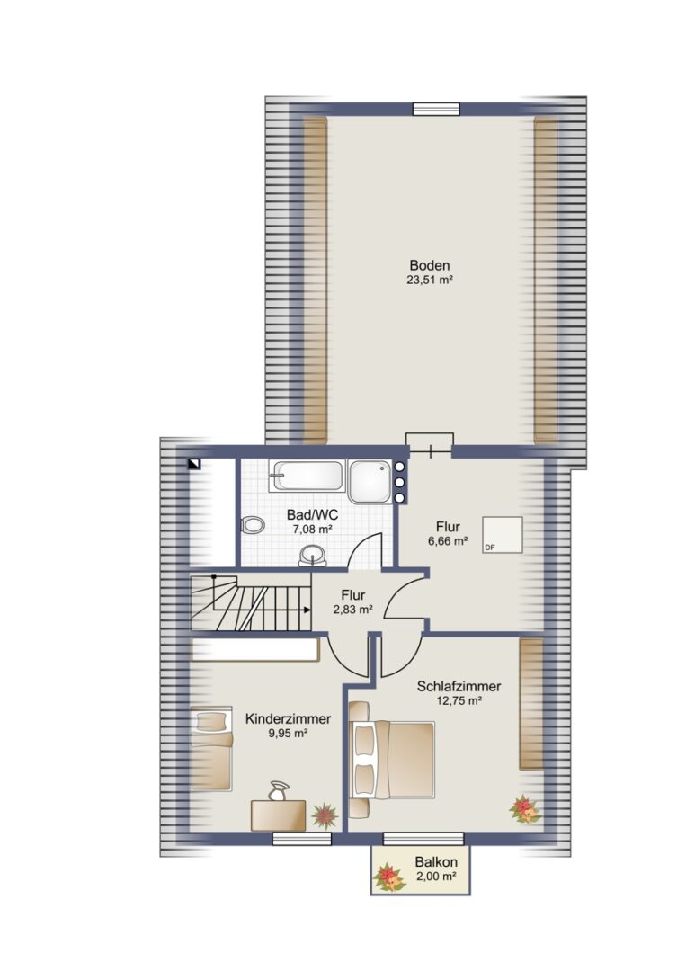 Im Dachgeschoss erwarten Sie zwei gut geschnittene Schlafzimmer – hell, ruhig und mit Blick ins Grüne. Das größere der beiden Zimmer punktet mit einem französischen Balkon – für noch mehr Licht und ein besonderes Wohngefühl.